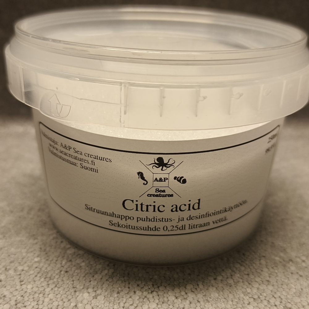 Sitruunahappo puhdistukseen ja desinfiointiin. Erittäin hyvä vaihtoehto etikalle välineiden puhdistamisessa, sillä toisin kuin etikka, sitruunahappo ei tärvele kumi- tai muoviosia.